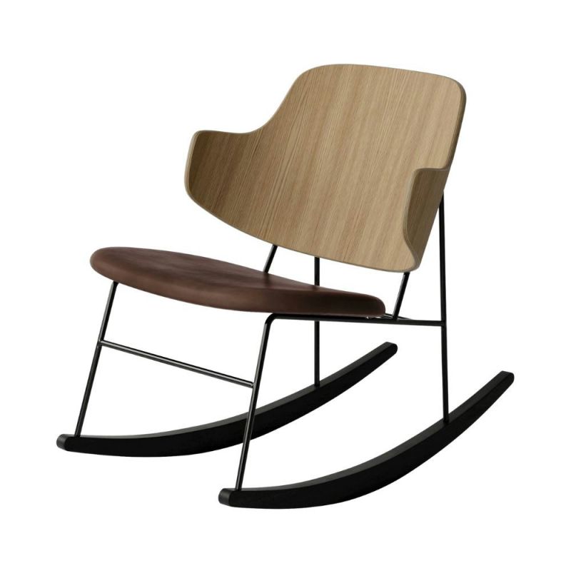 Penguin Rocking Chair. The Penguin Rocking Chair leans on the American modernism of the 1950s and 60s and looks almost like a work of art in itself. The open construction combines a curved back in oak or walnut veneer with an upholstered seat in fabric or leather and a rigid steel frame. Designed by Ib Kofod-Larsen in 1953, the chair is playful and contrasting, yet well-proportioned and harmonious. An iconic piece of Danish design heritage, its sculptural, organic shapes and elegant silhouette make it more modern than ever before.