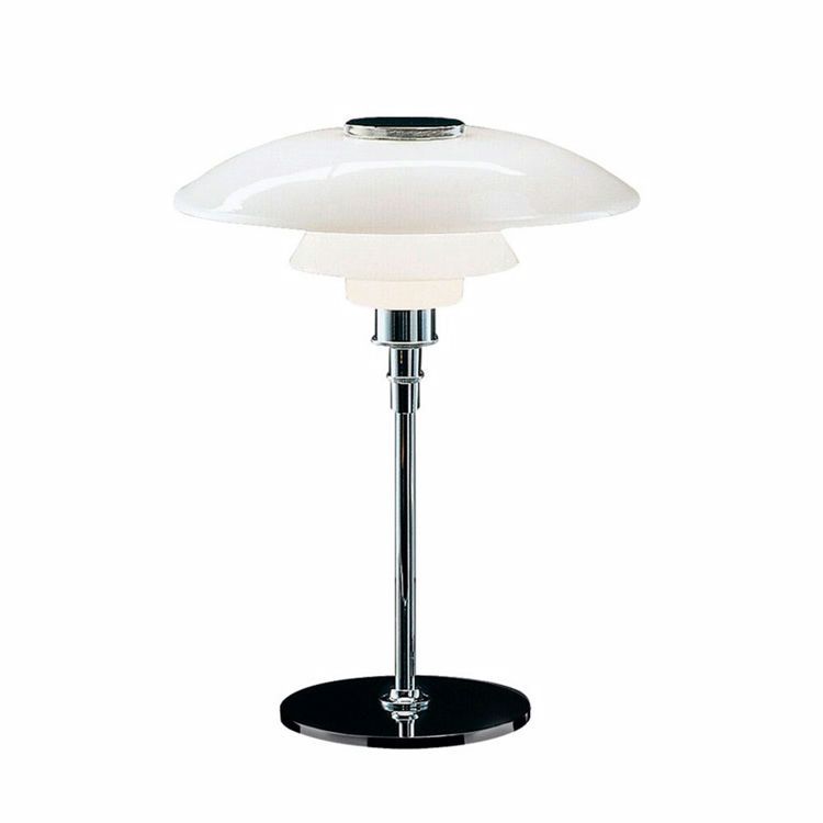The Louis Poulsen table lamp is made of turned high-gloss chrome-plated brass and the shades are mouth-blown opal glass. The PH 4½ - 3½ table lamp measures 55 cm in height and is ideal for use in the bedroom, office, hallway, living room or just anywhere in the home you want stylish and beautiful lighting.