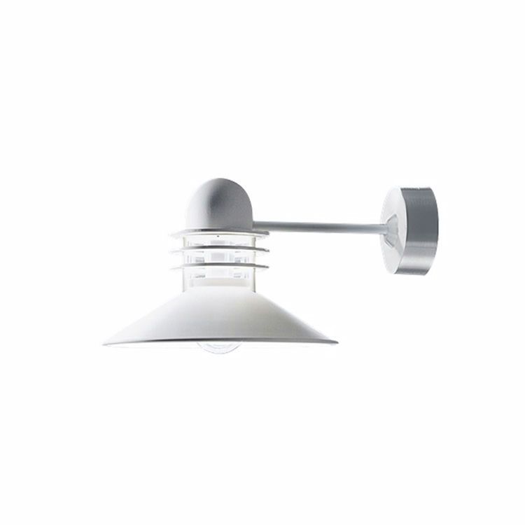 The Nyhavn outdoor lamp from Louis Poulsen was designed by Alfred Homann and Ole V. Kjær in 1976. The wall light was designed for a competition issued by Louis Poulsen. The wall light is available in Copper or White and is made of drawn copper or wet lacquered drawn aluminum.