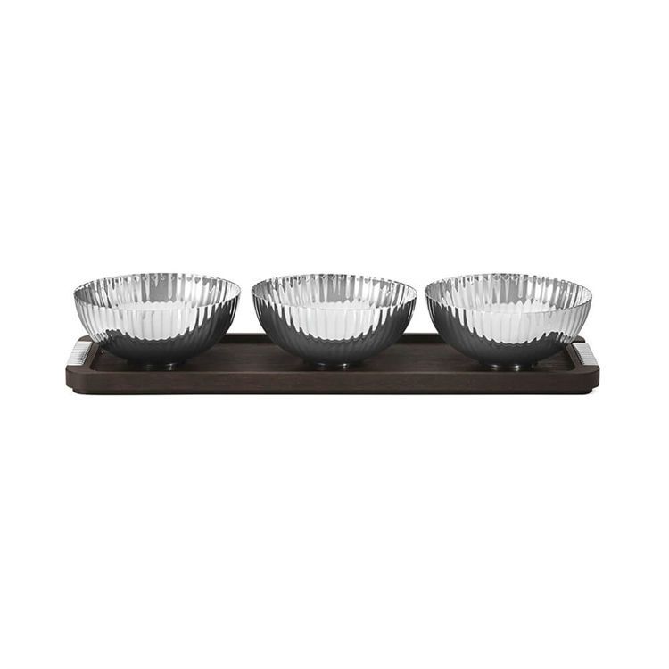 Bernadotte tray with three small bowls in a beautiful aesthetic design inspired by Prince Sigvard Bernadotte. The tray is made of smoked oak and has a practical lacquered surface with stainless steel details. The timeless design of the bowls in polished stainless steel is adorned with the iconic grooves that the Bernadotte collection is known for.