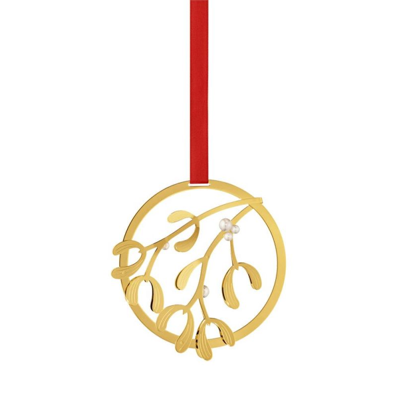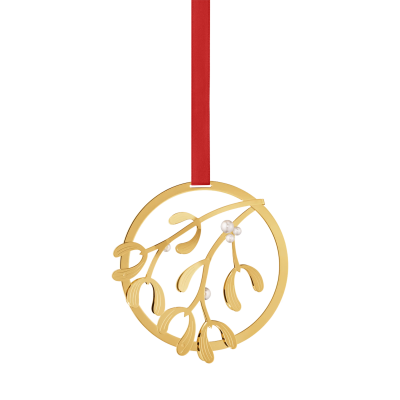 This elegant Christmas decoration becomes part of Georg Jensen's regular Christmas collection. It is made of brass, plated with 18-carat gold, and the motif is a mistletoe branch in a round frame. A red ribbon is included, allowing the decoration to be hung on the tree or create a cosy Christmas atmosphere elsewhere in the home.