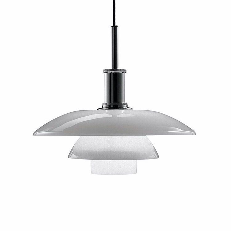 Poul Henningsen's PH 4½-4 glass pendant lamp from Louis Poulsen is a well-known designer lamp. The lamp is designed to cast the majority of the light downwards. The shades are made of mouth-blown opal glass, which is glossy on the outside and sandblasted matte on the inside. This gives a soft and diffused lighting.