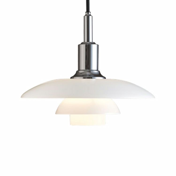 Louis Poul Henningsen's PH 3/2 pendant designed by Poul Henningsen. A well-known and beloved design icon. The pendant is available in chrome, brass and black chrome. The shades are made of mouth-blown opal glass and are his well-known 3-shade system that provides soft and glare-free lighting.