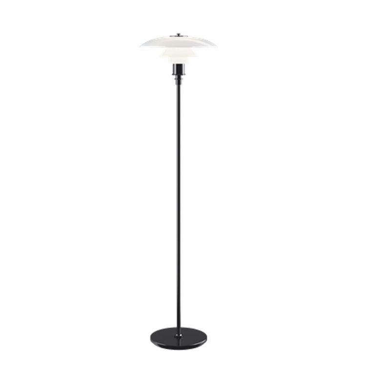 Poul Henningsen's beautiful lamp designs are well known, loved and seen in many homes. Louis Poulsen has created many iconic designer lamps, designed by some of Denmark's greatest designers. The PH floor lamp in black chrome is made of black metallized steel with mouth-blown opal shades.