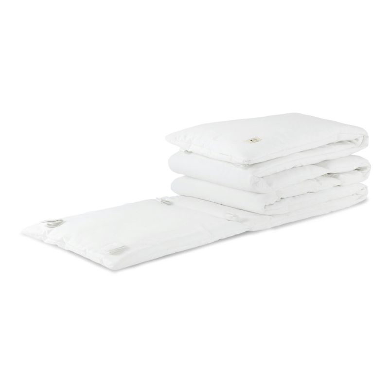 The cot bumper is designed specifically for our Kai baby bed and therefore follows the gentle curve of the bed. It is made of 100% organic cotton with a heavier cotton fabric so it stands up securely at the curved ends.