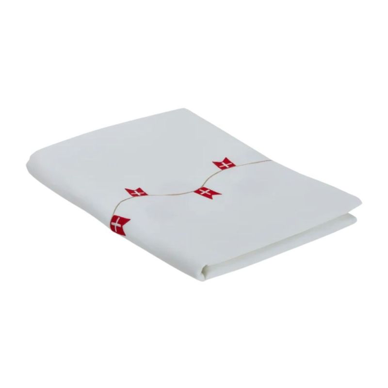 Birthday Tablecloth with Embroidered Flags A Classic Celebration. The popular birthday tablecloth pays homage to the Danish tradition of flags on the table for life's festive moments. With embroidered Dannebrog flags winding down the center, it brings joy and familiarity to the table setting. Part of Langkilde & Søn's FEJRING collection, a series of high-quality tablecloths and napkins that can be used for generations. The tablecloth is made of durable fabric and is machine washable.