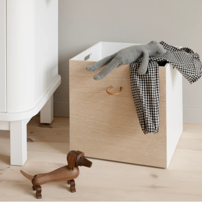 The Wood storage boxes fit all Wood shelving units. The storage boxes have 3 white sides and one oak side. Additionally, they feature 2 small handles made of core leather for lifting and pulling out. The 2 handles are mounted on the box's white side and the oak side. This way, you can individually choose whether the front facing the room should be white or oak, significantly affecting the shelf's appearance.