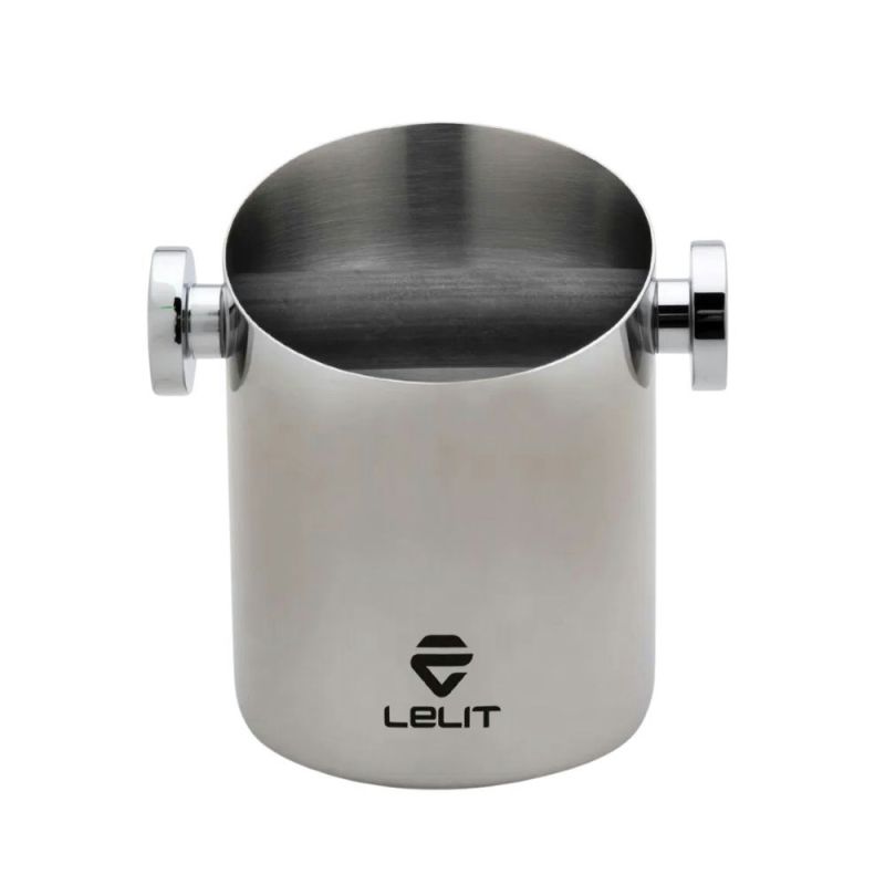 Lelit Knock Box is an elegant, cylindrical tool made from brushed stainless steel, with a non-slip base and a rubber-coated bar for shock absorption. It can hold up to 10 coffee grounds and includes a microfibre cloth and a brush with natural bristles.