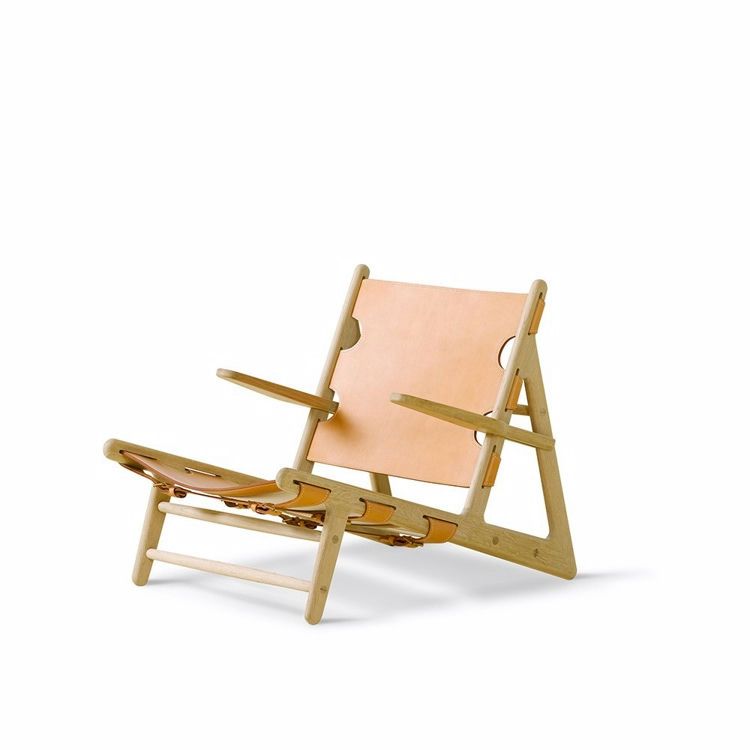 Designed by Børge Mogensen in 1950, the hunting chair is made of solid oak and grain leather.