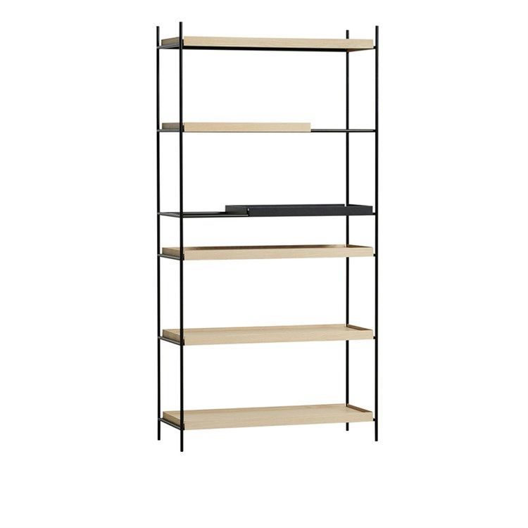 Designed by Hanne Willmann, the Tray Shelf from Woud is available in many decorative and exciting combinations. The shelf is available in both a high and a low version, but here you see the high version with a total of 6 shelves, 2 short and 4 long.