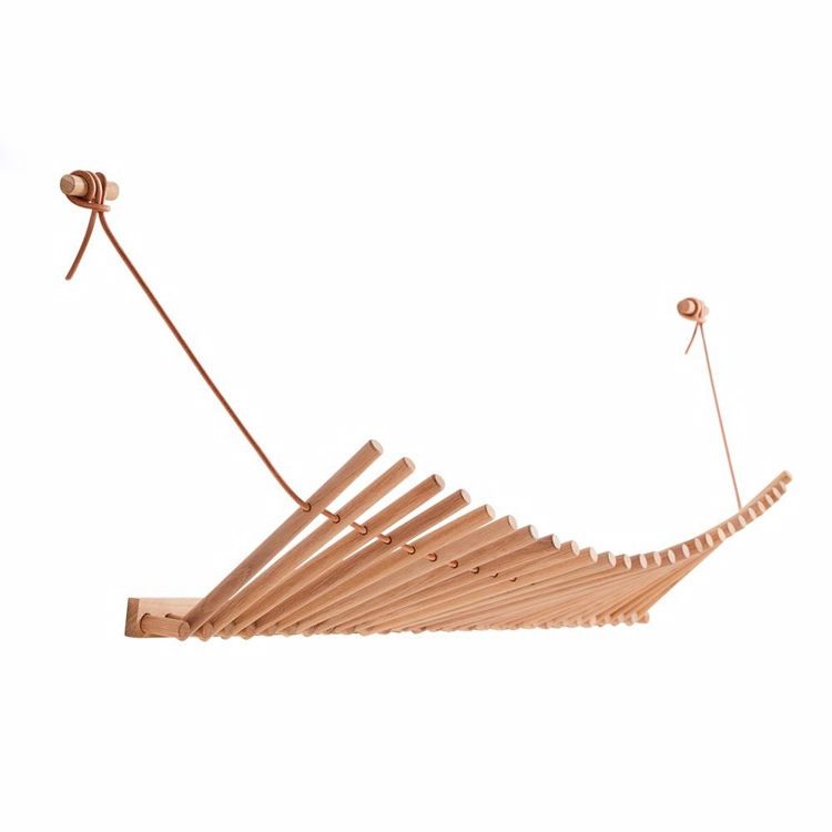 The Knaegt shelf, which combines the hat shelf with the coat rack, is produced by Danish Woud with design by Rikke Palmerston. Knaegt consists of wooden sticks in oak and a leather cord and is available in the colors oak or black painted oak. The shelf's leather cord makes the shelf flexible as the wooden pegs move according to how much and how clothes, hats and other accessories are placed on it.
