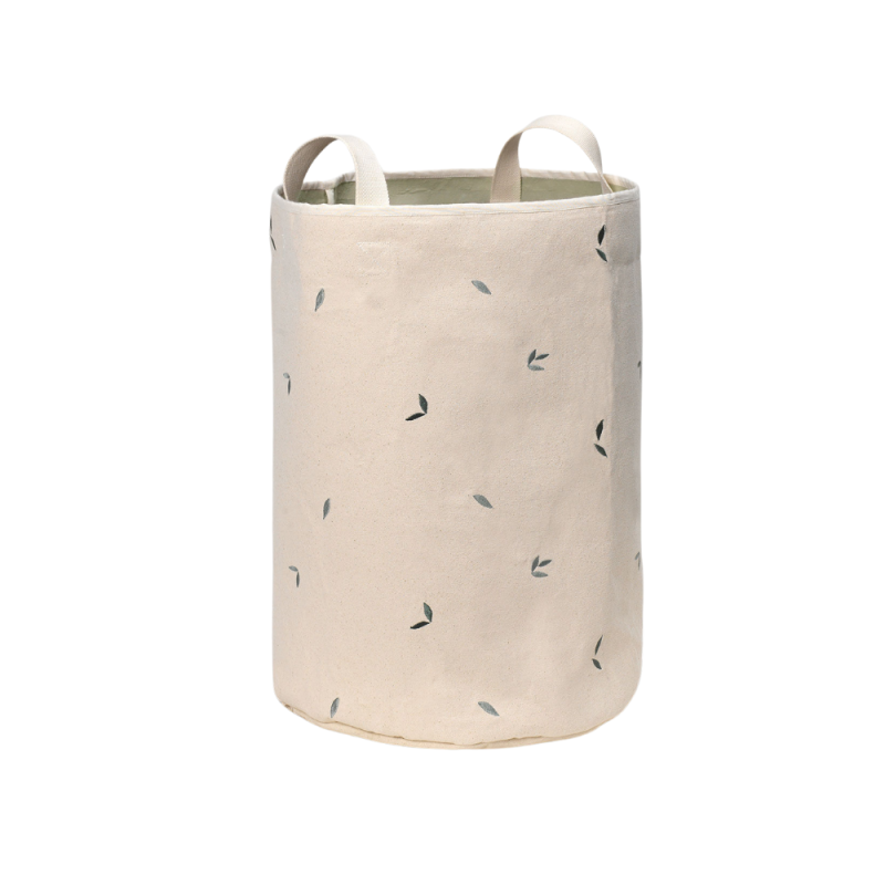 Beautiful storage baskets with fine embroidered leaves. The baskets have an outer surface of undyed heavy canvas, where the naturalness is emphasized in the form of the small green leaves and fine veins in the fabric, which originate from the husk parts of the cotton plant. Undyed fabric saves nature a lot of unnecessary chemicals, such as bleaches and dyes. And we think it doesn't get more beautiful than here in its pure and natural color. The baskets are reversible and have one side with embroidery and one plain side in light dusty green, so you can vary the look as desired