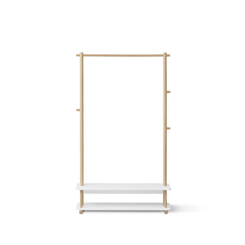 The Camp clothes rack is reminiscent of a four-poster bed frame in design and has space for both ballet shoes and hiking boots on the two shelves at the bottom. Quirky details like small round hooks on the outside of the beautifully shaped oak rods make it easy for kids to access and organize everything from rainwear to invisibility cloaks.