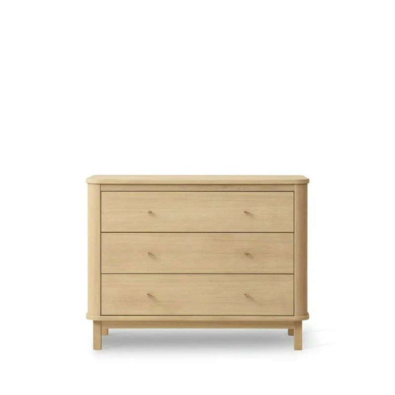 • Material: The Wood 3-drawer chest is made of MDF veneered with oak, with legs and hooks in white oiled solid oak. The inside of the drawers are made of white painted MDF. Natural wood can have different tones and appearance. Small tonal differences across the pieces may occur. Please note that wooden surfaces may fade in direct sunlight. The invisible screws give the chest a clean and exclusive design and are particularly characteristic of Oliver Furniture. The style is modern with clean lines, rounded shapes and refined details such as grain leather handles and integrated hooks. A special soft-close function cushions the closing of the drawers to prevent small fingers from getting trapped. The chest is produced in Europe and complies with European safety standards and norms. The chest is treated with white pigmented oil based on linseed, sunflower and jojoba oil. Inside, the drawers are painted with non-toxic, REACH-certified paint.