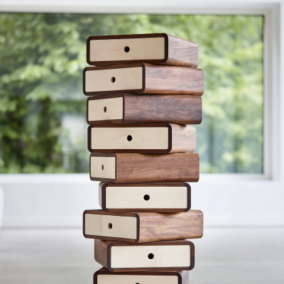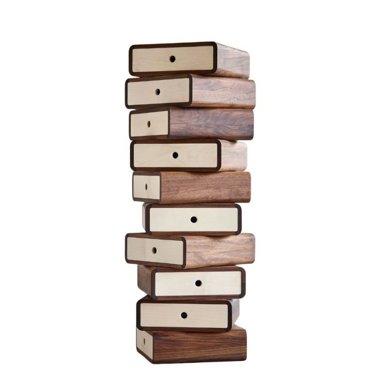 The Turning Boxes storage chest is a wooden chest of drawers consisting of 10 drawers, each of which can be rotated 360 degrees. AK 1020 is a sculptural and decorative piece of furniture that can change its expression depending on its surroundings and invites a playful approach to home interior design. This makes it possible to create a completely unique and functional piece of furniture that fits your individual needs exactly.