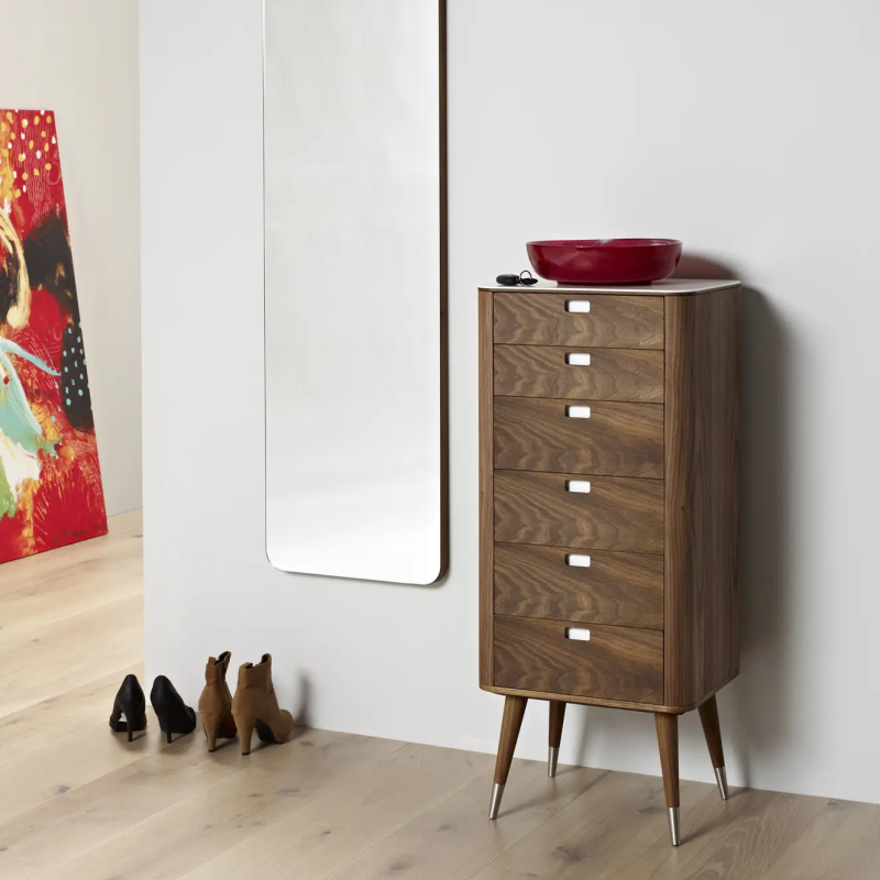Naver Collections modern AK 2405-2431 chest of drawers series not only brings order to your home, its also a feast for the eyes. The curved edges make the chest of drawers visually beautiful from every angle, and the tall point legs give it a light and elegant look. There is a real attention to detail here, with a Corian top and solid wood drawers with dovetail jointshallmarks of genuine craftsmanship, made to last for generations.