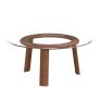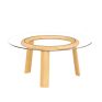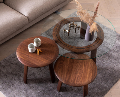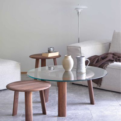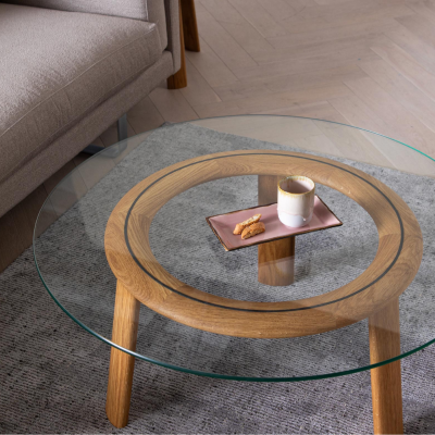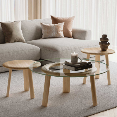 Exclusive glass coffee table AK 650 Loop and AK 610 Loop side tables designed by Hans Sandgren Jakobsen. The round glass top offers an unobstructed view of the beautiful, architectural wooden construction. The tables aesthetics invite the eye to wander further down to the textures of the floor, the patterns of the rugs, and the rooms other details. A recessed leather cord in the wooden ring holds the glass top elegantlydiscreet, yet effective.