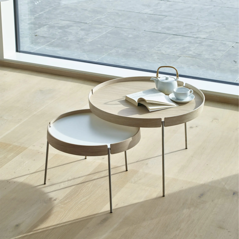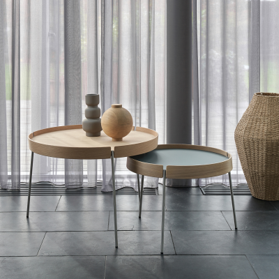 The AK 710-725-750 Turn tray tables give you the opportunity to play with your creativity. The coffee tables can be combined into a completely personal coffee table or used individually, for example as a side table next to an armchair. The tables are available in three different diameters and two heights, making it possible to combine several in harmonious constellations. Choose between eight current laminate colours and three exclusive wood types that add warmth and character. Whatever the combination, the result is a clean-lined piece of furniture that is both practical and visually light and elegant in the room.