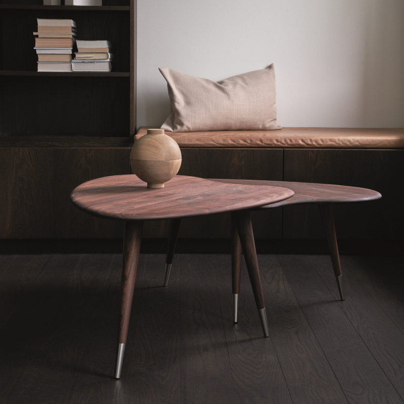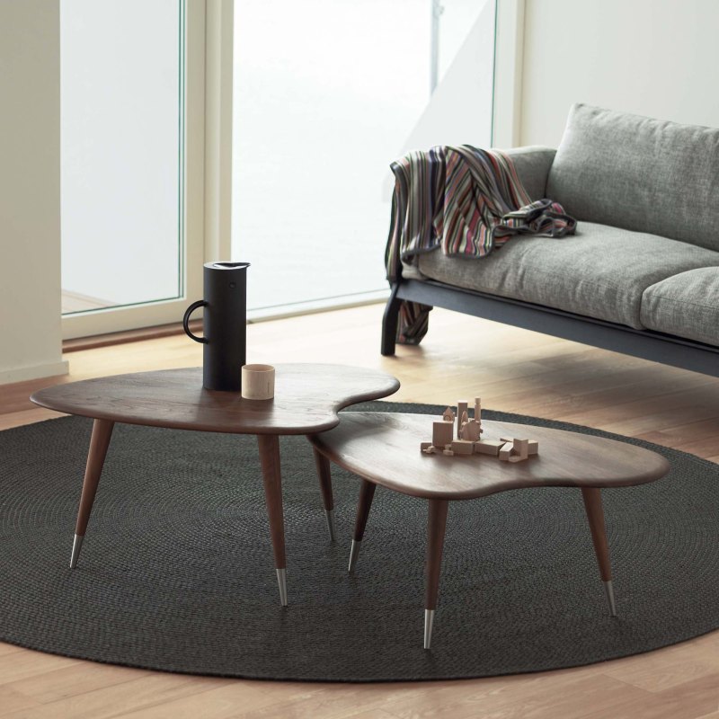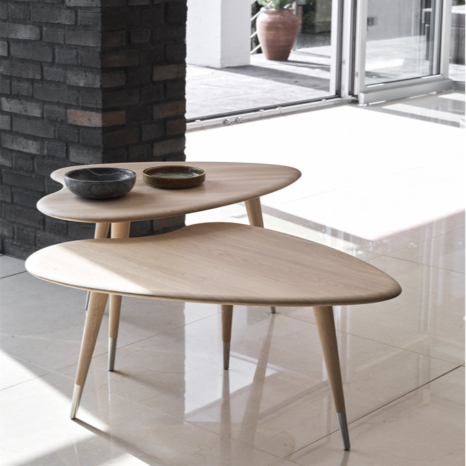 Elegance and lightness are the first associations when you see the AK 2560 coffee table. Like a ballerina, it balances on slender, tapered legs finished with steel caps. The solid wood tabletop is shaped like a strawberry a design by Nissen & Gehl MDD, which has given the table the name Strawberry.